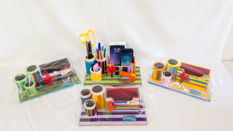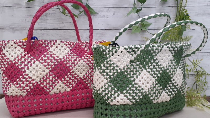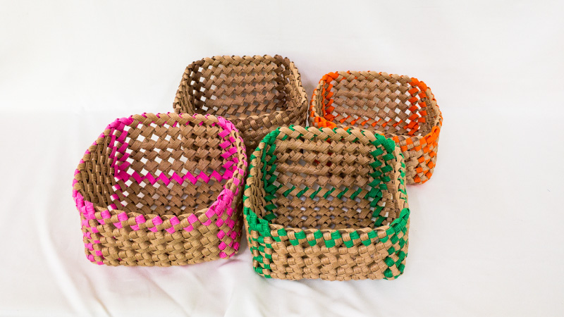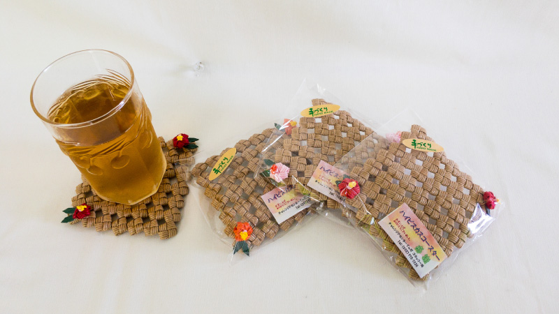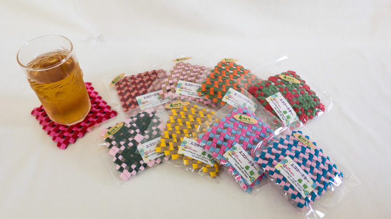 エコクラフトを活用してペン立て、スマホ立て、バッグ、コースターなど多くの商品を作っており、その他ミシンや手縫いでの縫製作業もあります。